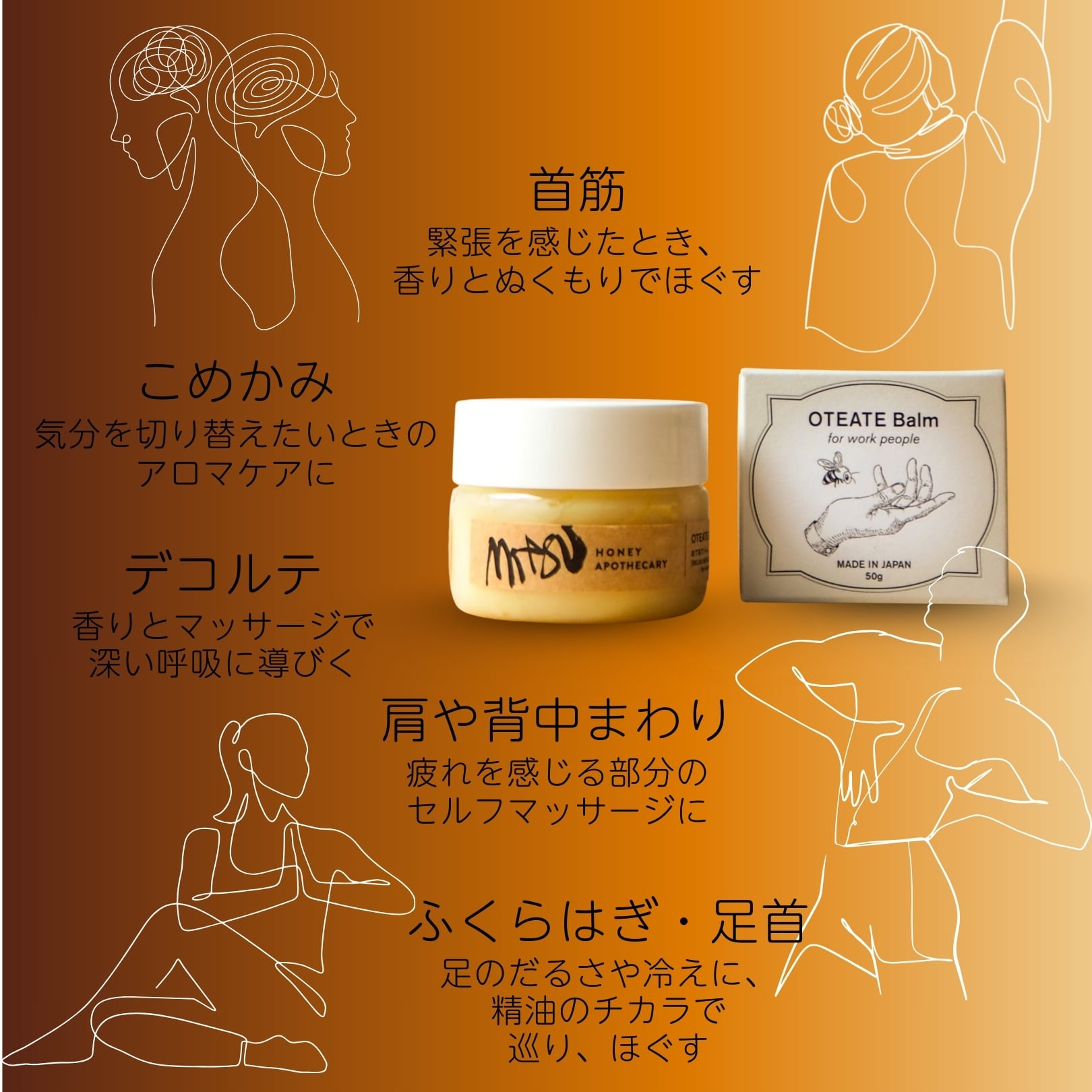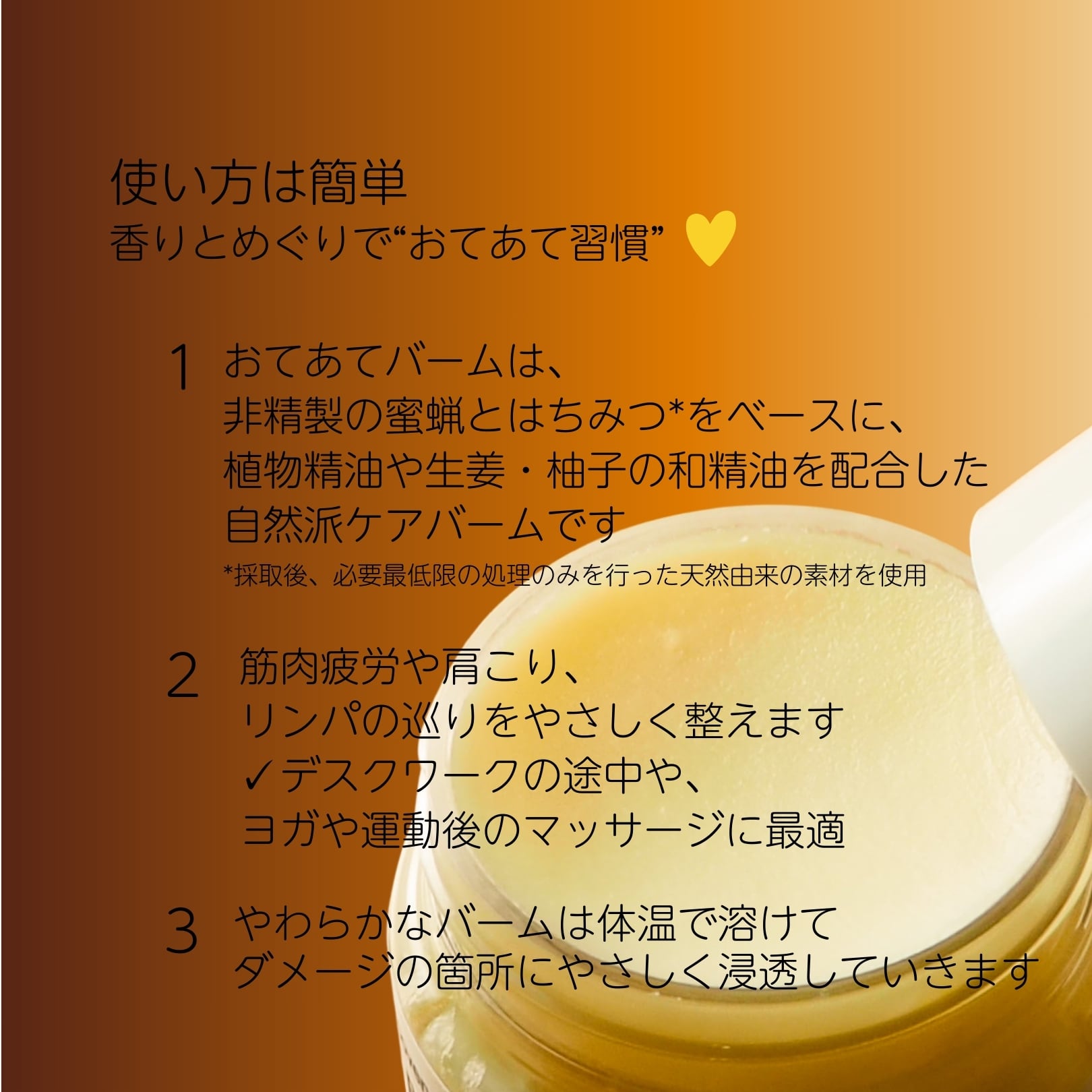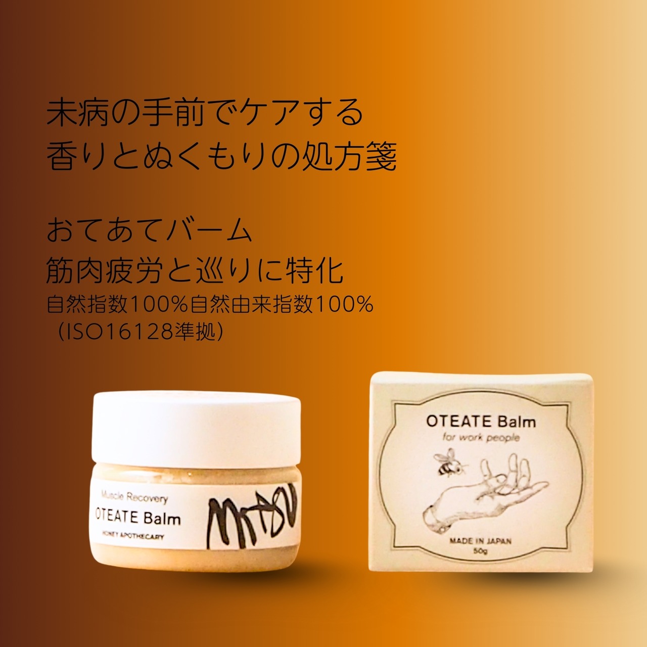 自社養蜂場で採れた ハチミツ(保湿) と 蜜蝋(保護) をベースに、筋肉のハリや疲れをやわらげるメディカルグレード精油を贅沢にブレンド。自然指数100%のやさしい処方で、毎日のお手入れに取り入れやすいバームです。