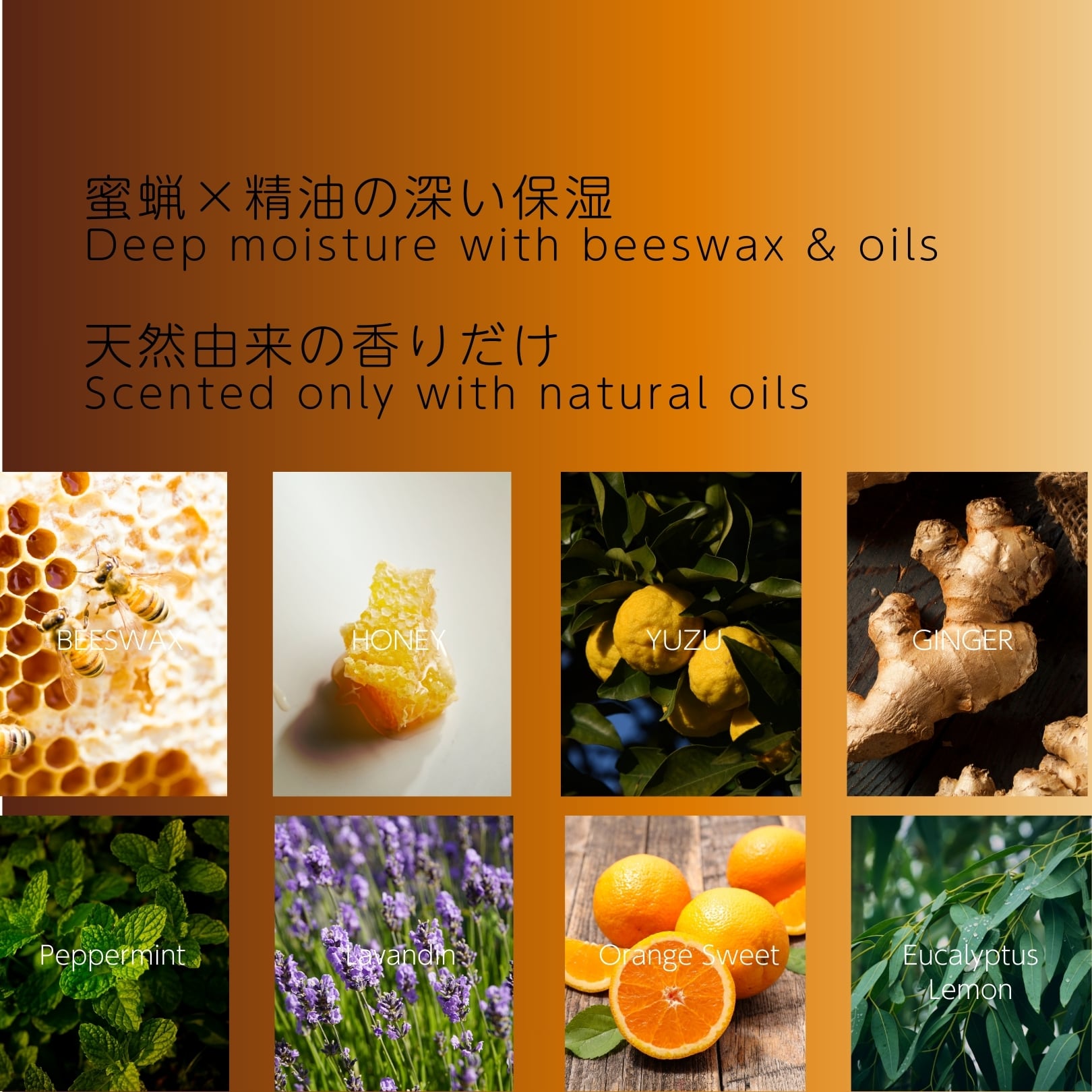 ホホバ種子油、ミツロウ、ゴマ種子油、ヒマワリ種子油、ハチミツ、シア脂、ツバキ種子油、セイヨウハッカ油(ペパーミント)、ラバンデジュラハイブリダ油(ラバンジン)、スイートオレンジ果皮油、ショウガ根油(四万十生姜)、ユズ果皮油(四万十柚子)、クスノキ茎油(ホーリーフ)、ジャワシトロネラソウ葉油(シトロネラ)、ユーカリシトリオドラ油(ユーカリレモン)